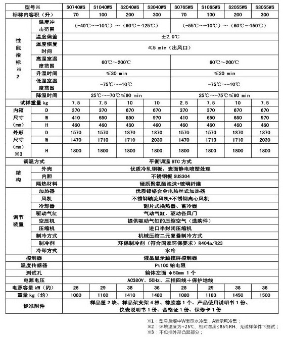 MC028系列溫度沖擊試驗(yàn)箱  一、產(chǎn)品簡(jiǎn)介 用途:適用于對(duì)電工、電子和其他軍用設(shè)備在周圍大氣溫度急劇變化條件下的適應(yīng)性試驗(yàn)。 特點(diǎn): 1.充分吸收國外同類產(chǎn)品的優(yōu)點(diǎn),采用兩箱式上下結(jié)構(gòu),上箱體為高溫箱,下箱體為低溫箱。也可根據(jù)用戶要求設(shè)計(jì),制造左、右結(jié)構(gòu)的兩箱式溫度沖擊試驗(yàn)箱。也可以根據(jù)用戶要求采用單相式(或三箱式)結(jié)構(gòu)設(shè)計(jì)。 2.觸摸屏+PLC可編程邏輯控制器,RS485接口。 3.有工作室超溫、壓縮機(jī)過載、超壓、油壓超壓、風(fēng)機(jī)過載、缺相、壓縮機(jī)延時(shí)等保護(hù)功能,還有若干用戶選配的安全保護(hù)功能,如風(fēng)速過低,大門未關(guān)閉等等。 4.可選配遠(yuǎn)程監(jiān)控計(jì)算機(jī)及軟件,上位機(jī)實(shí)行冗余設(shè)計(jì),可連接PC電腦,也可連接觸摸屏控制器。上位機(jī)關(guān)機(jī)不影響系統(tǒng)控制。 二、技術(shù)參數(shù):